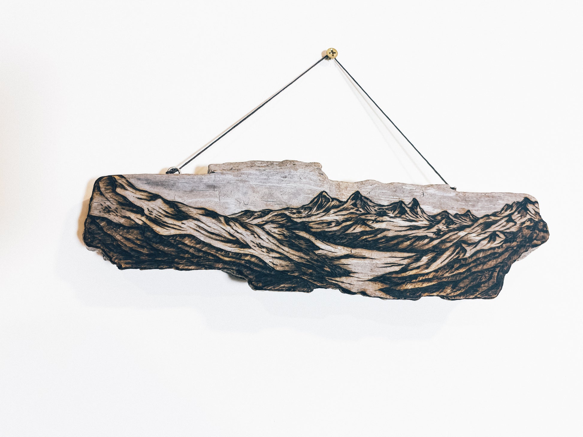 What You Get: A large driftwood statement piece, featuring a wood-burned depiction of the Mendenhall Towers.